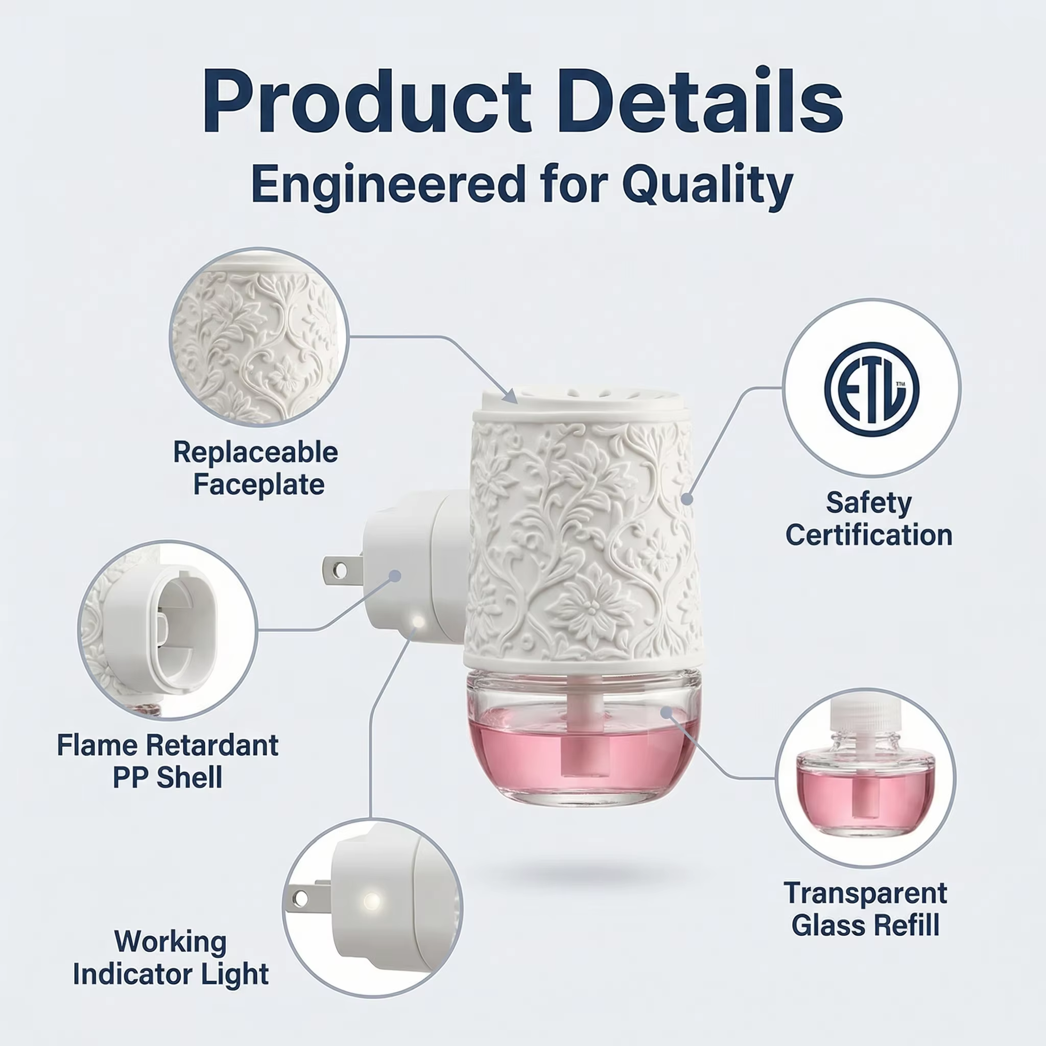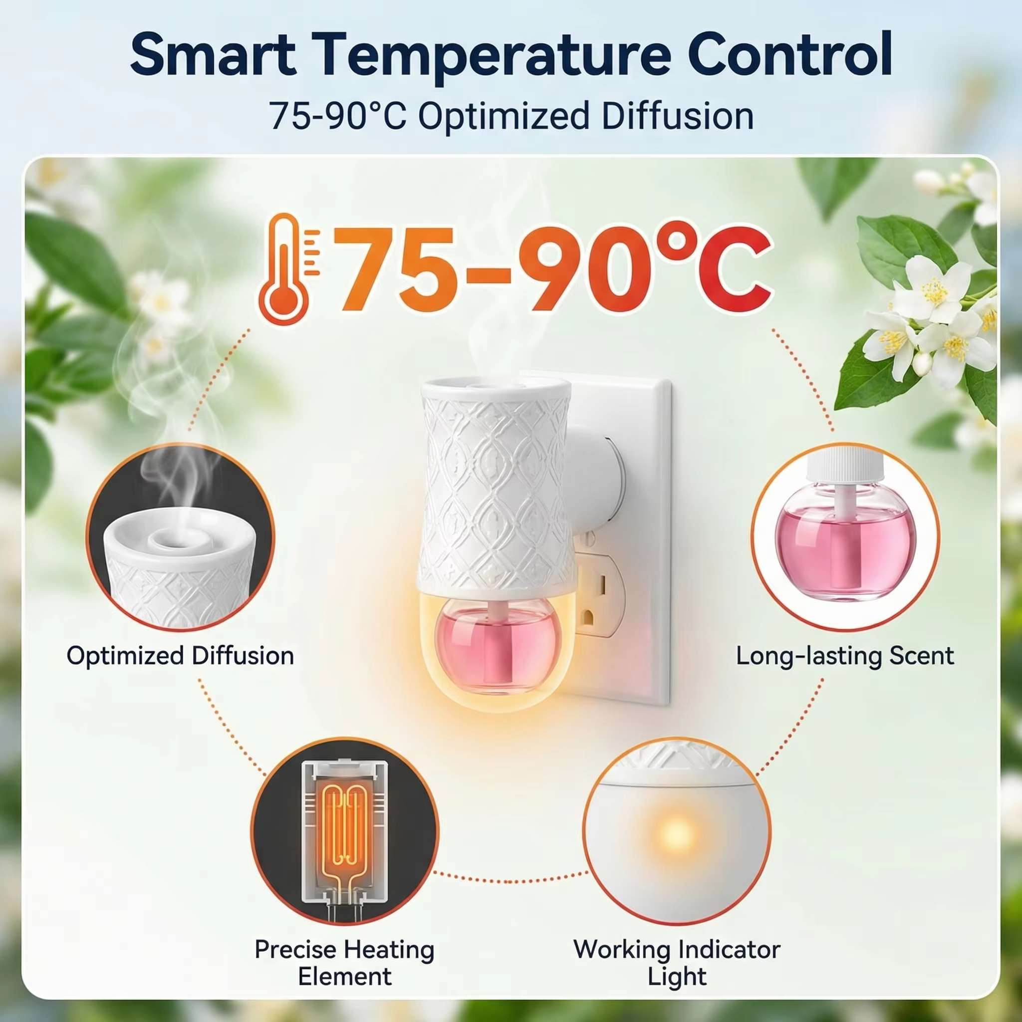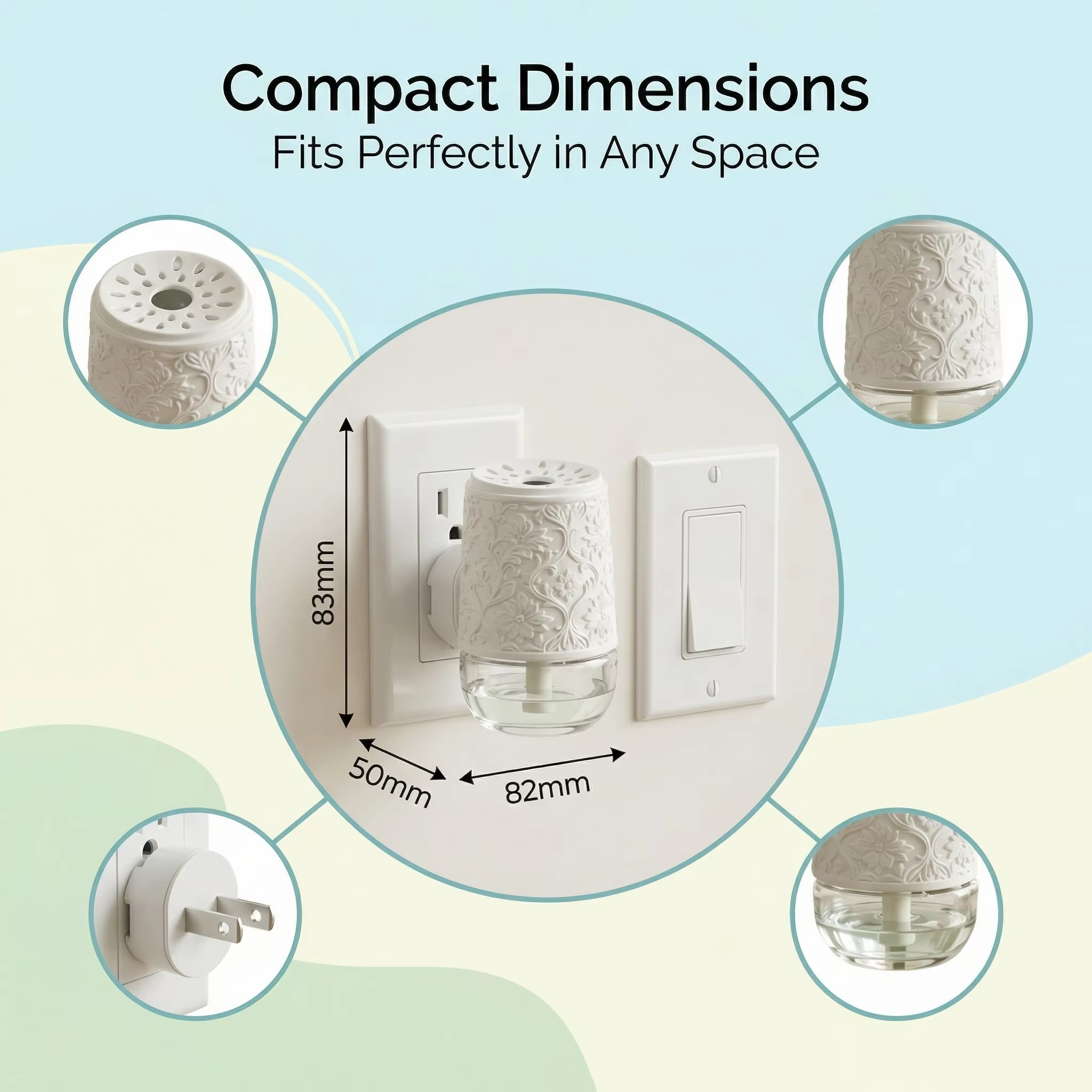 Compact Design: Fits perfectly in any space with dimensions 83 mm x 50 mm x 82 mm. Plug-in Operation: Easy to use with standard electrical outlet. Elegant Aroma Diffusion: Delivers subtle fragrance for a relaxing atmosphere.